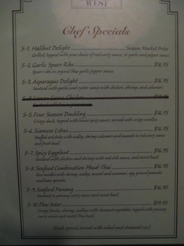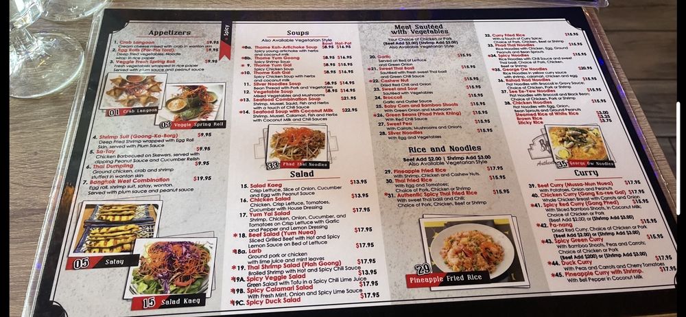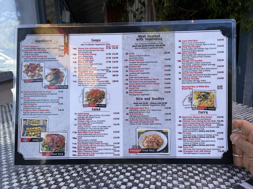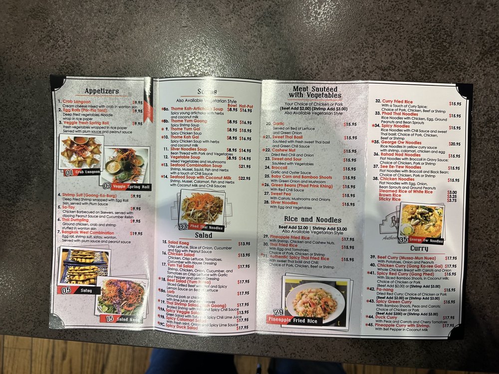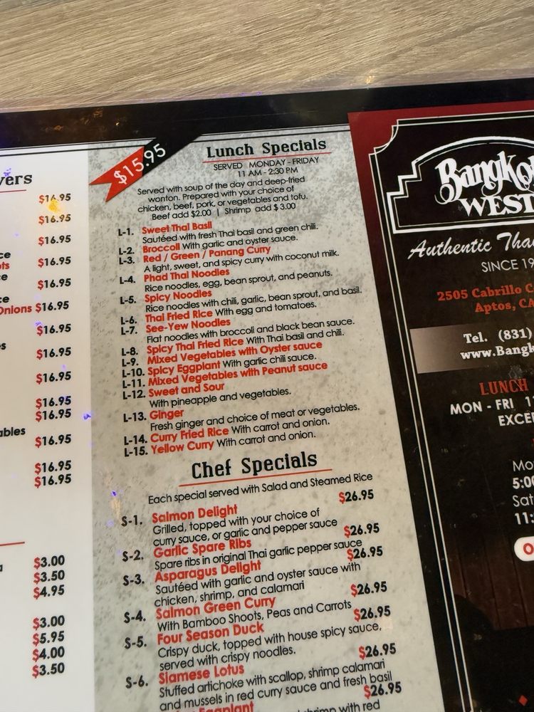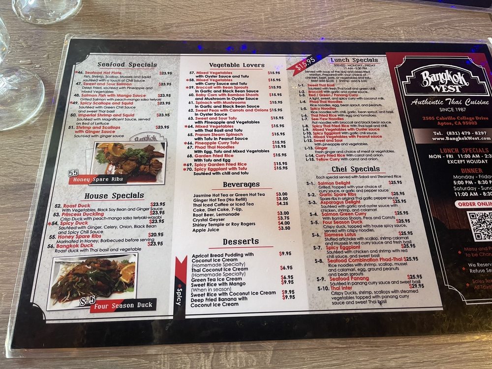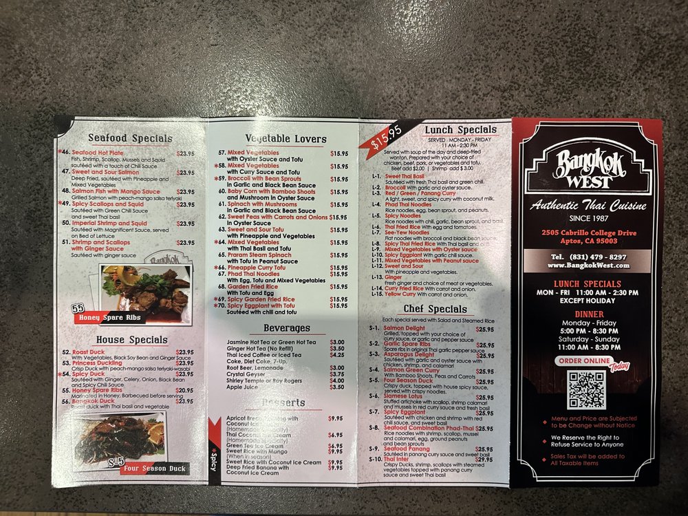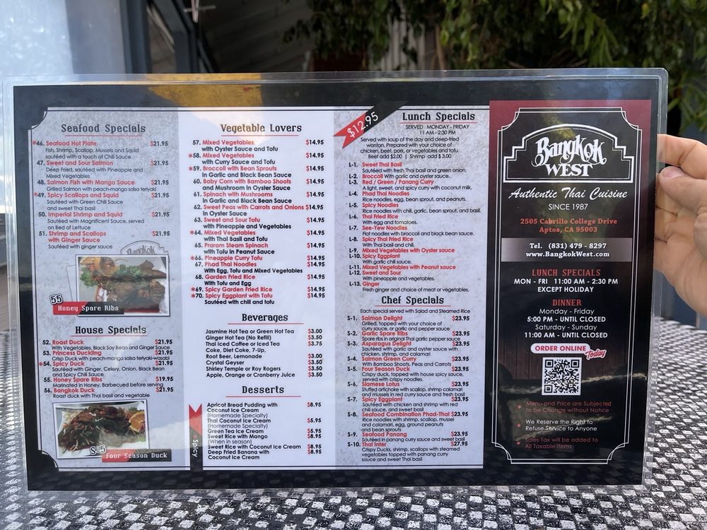 Welcome to Bangkok West, a delightful Thai restaurant located in Aptos, California. Known for its warm ambiance reminiscent of a golden palace, Bangkok West offers a menu that tantalizes the senses. Start your culinary journey with appetizers like the delectable Crab Rangoon or Thai Dumplings, each crafted with care. The soups are standout options, such as the Tom Kha Gai, rich with flavor and herbaceous notes.